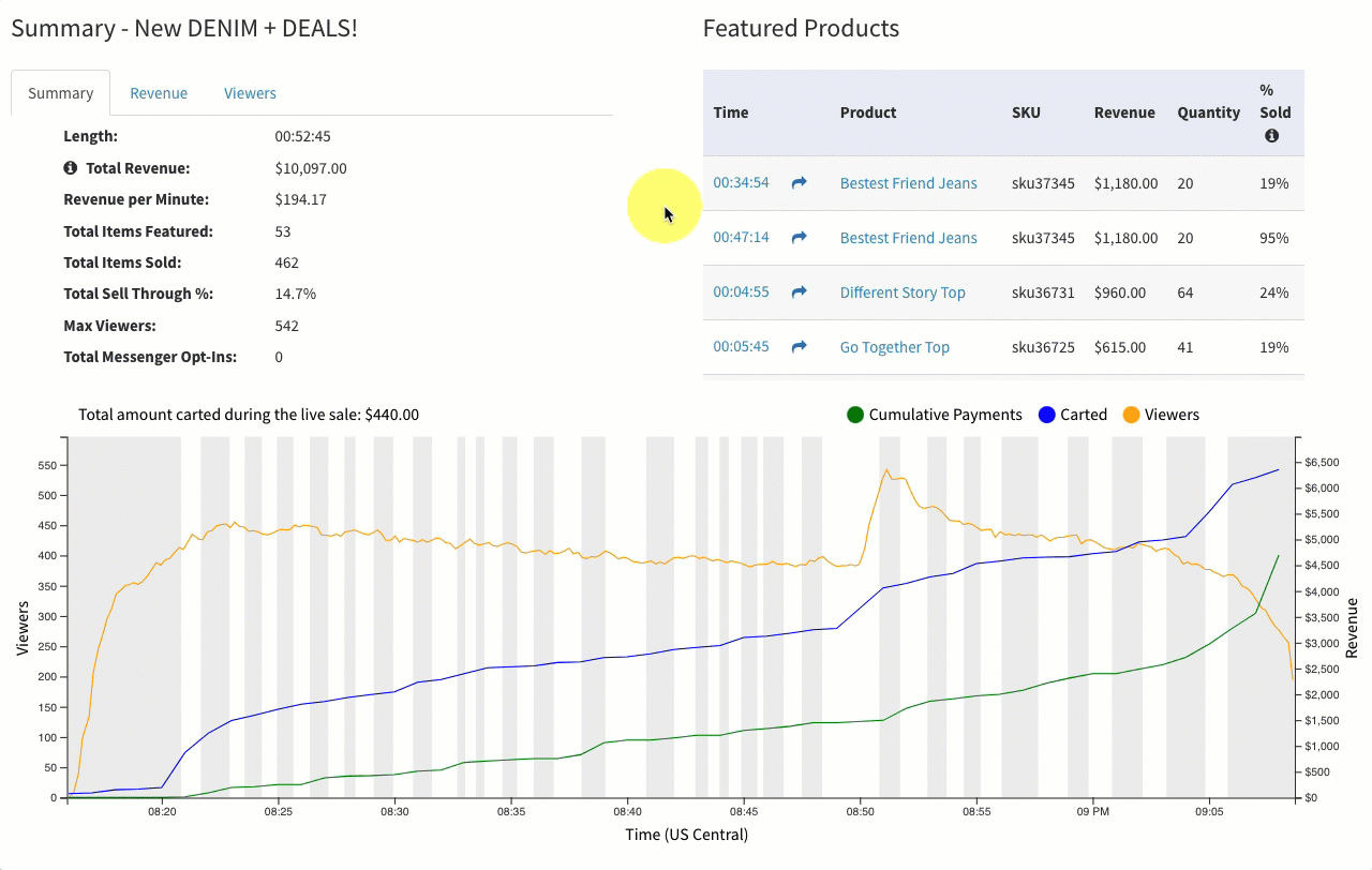 You can track these metrics to view the high and low moments of your live sale, which products drove a spike in carted items, etc.