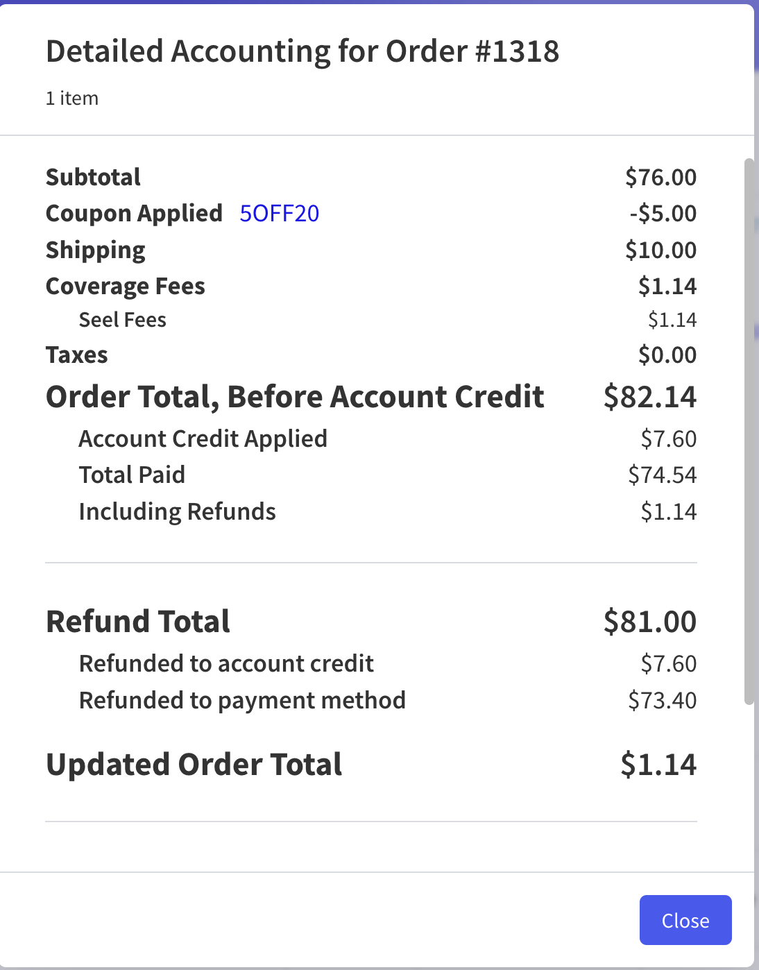 Issue: Unable to refund the correct amount or receiving an error This usually occurs when the order has been split. If so, you’ll need to process the refund from the original order. Issue: Only showing option to Refund As Account Credit
