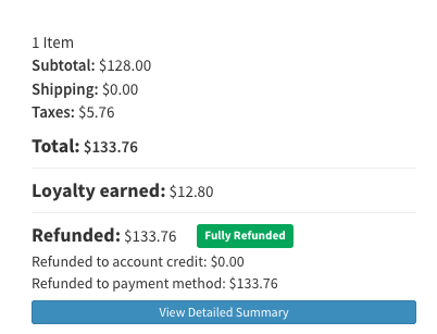 - Retract Loyalty. Enable this toggle if you have an active loyalty program and the customer earned loyalty credits for this purchase. This will automatically display the amount that will be retracted from their discount credits once the refund is processed.