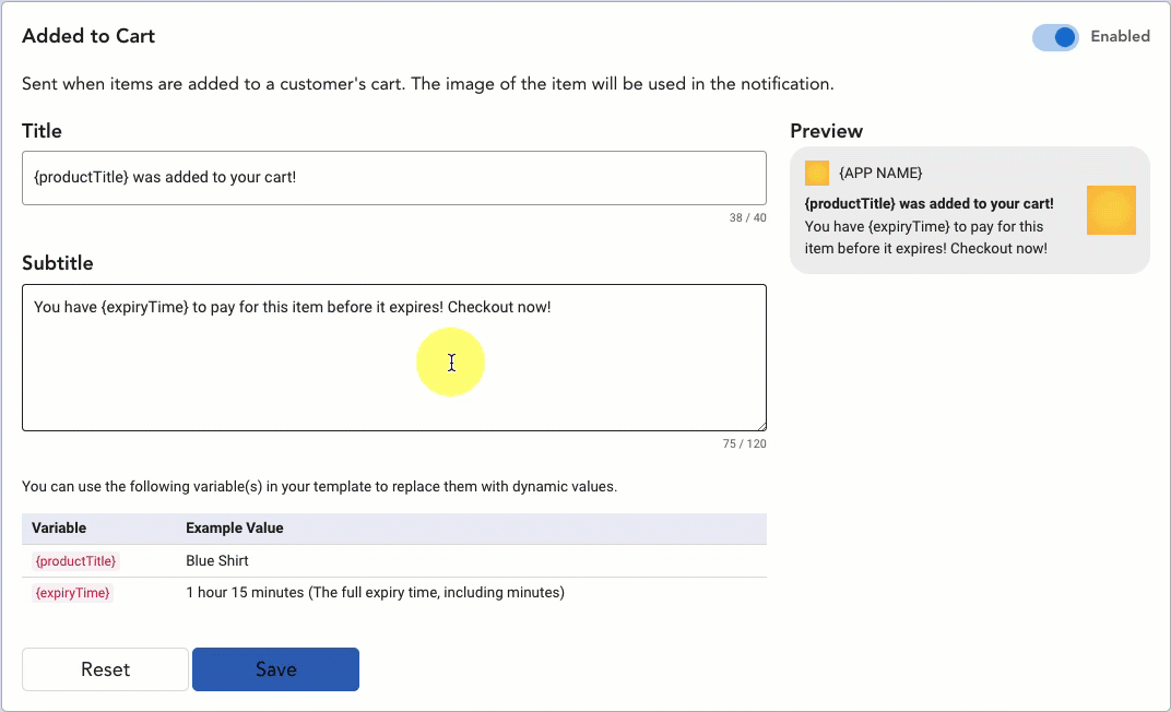 You can use the variable tags (e.g., {productTitle} and {expiryTime}) to fill the notification with a product name and countdown unique to the shopper. The {expiryTime} tag is not available with the First Paid First Served automation as CommentSold does not hold items for purchase with this setting.