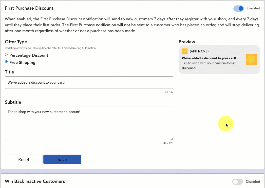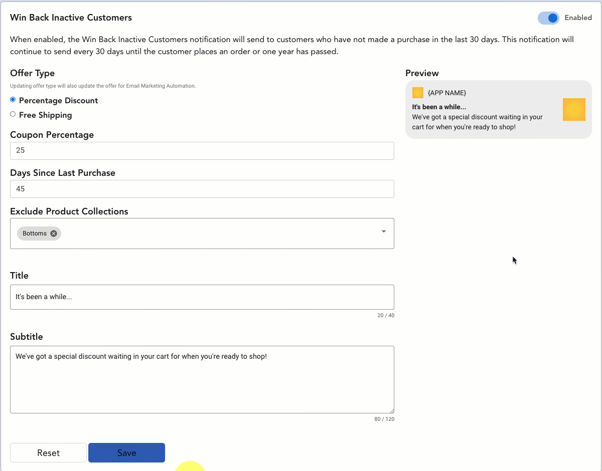 Note: Updating the offer here will also update the offer for your Win Back Inactive Customers email automation.