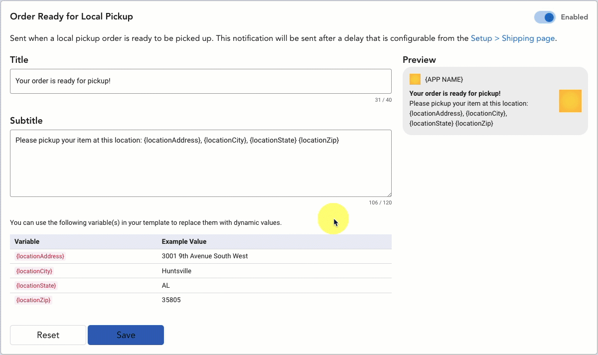 An Order Ready Local Pickup notification sends to customers who selected "Local Pickup" as their delivery method once their order is ready for pickup at your shop or warehouse.