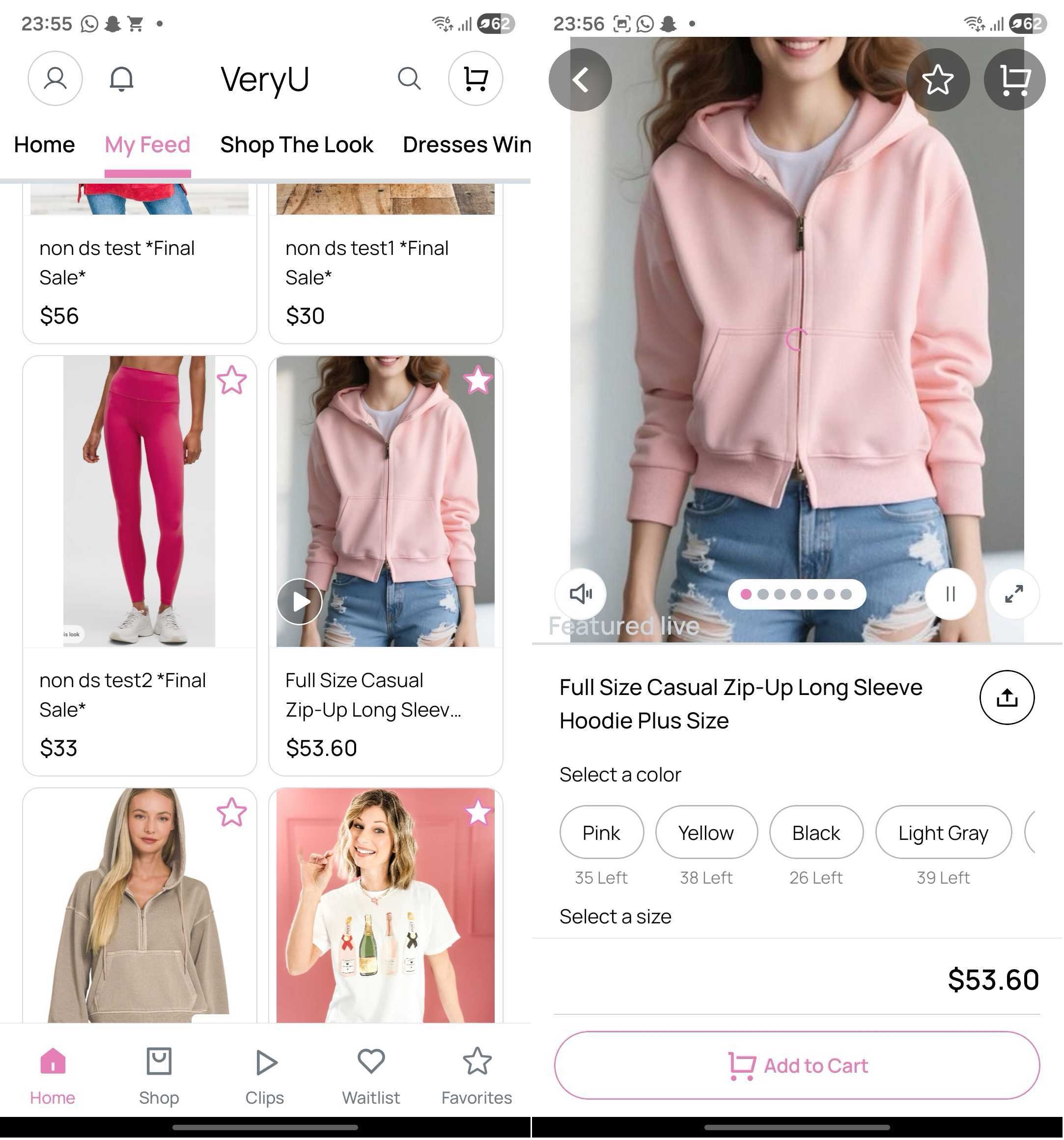 If a product has a video available, then a play button icon will appear in the bottom-left corner of the product thumbnail on both your webstore and mobile app. When the shopper selects the product, they can access the video and choose to play or pause it.