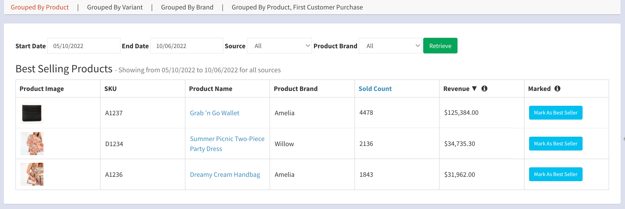 The Best Selling Products report provides retailers with a list of best-selling products and related details, such as size and color variants.