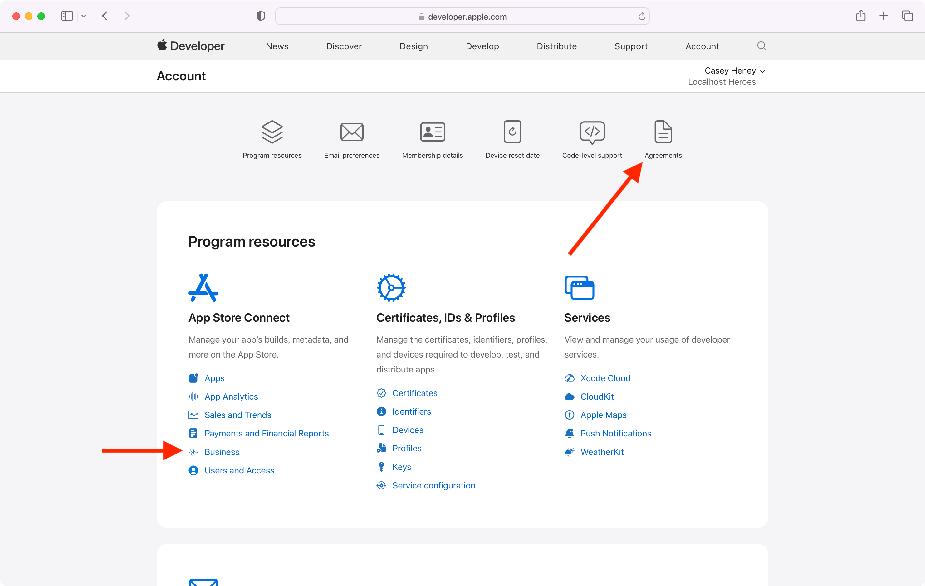 - Select Business under App Store Connect or Agreements from the options listed at the top.