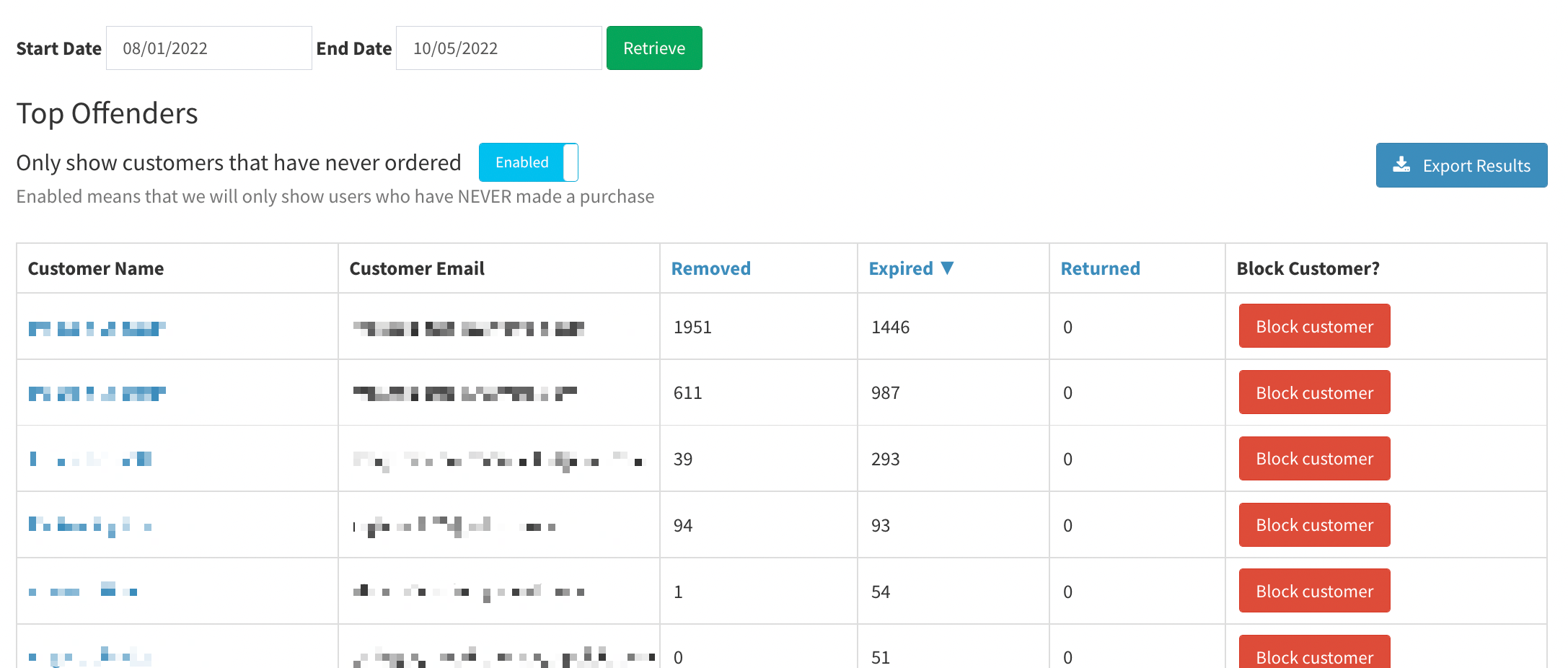 You can export this table to a .CSV file by selecting the Export Results button on the right side of the page. If you discover a shopper you wish to block from your business, select the Block Customer button on the far right of the shopper's row. Learn more about blocking shoppers here.