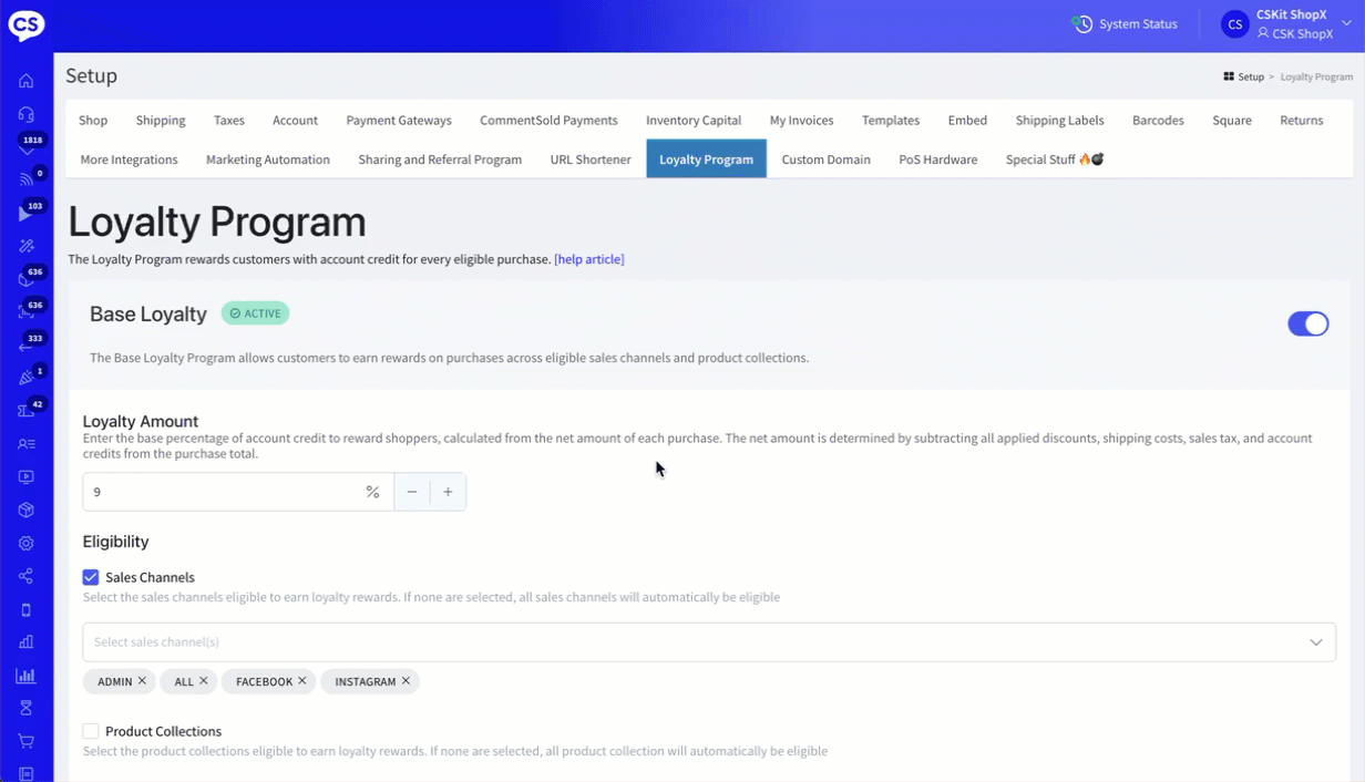 When you enable your loyalty program, you'll set a base percentage that registered shoppers can earn on every purchase. This includes the purchase of gift cards, waitlist authorized items, and comment charge purchases.