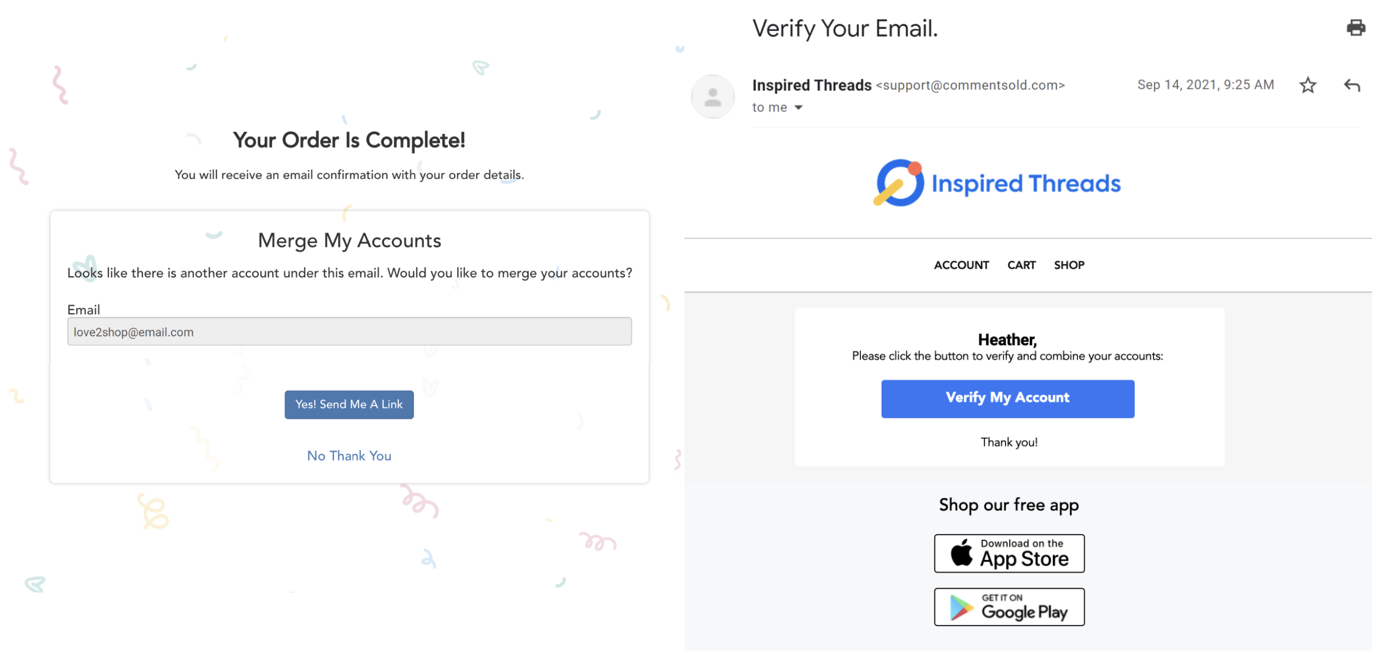 Once they enter their email and select Send Me a Link, the shopper will get an email that allows them to verify and combine their accounts. After selecting the Verify My Account button in the email, they'll be redirected to their account page where they'll be notified that the merge was successful.