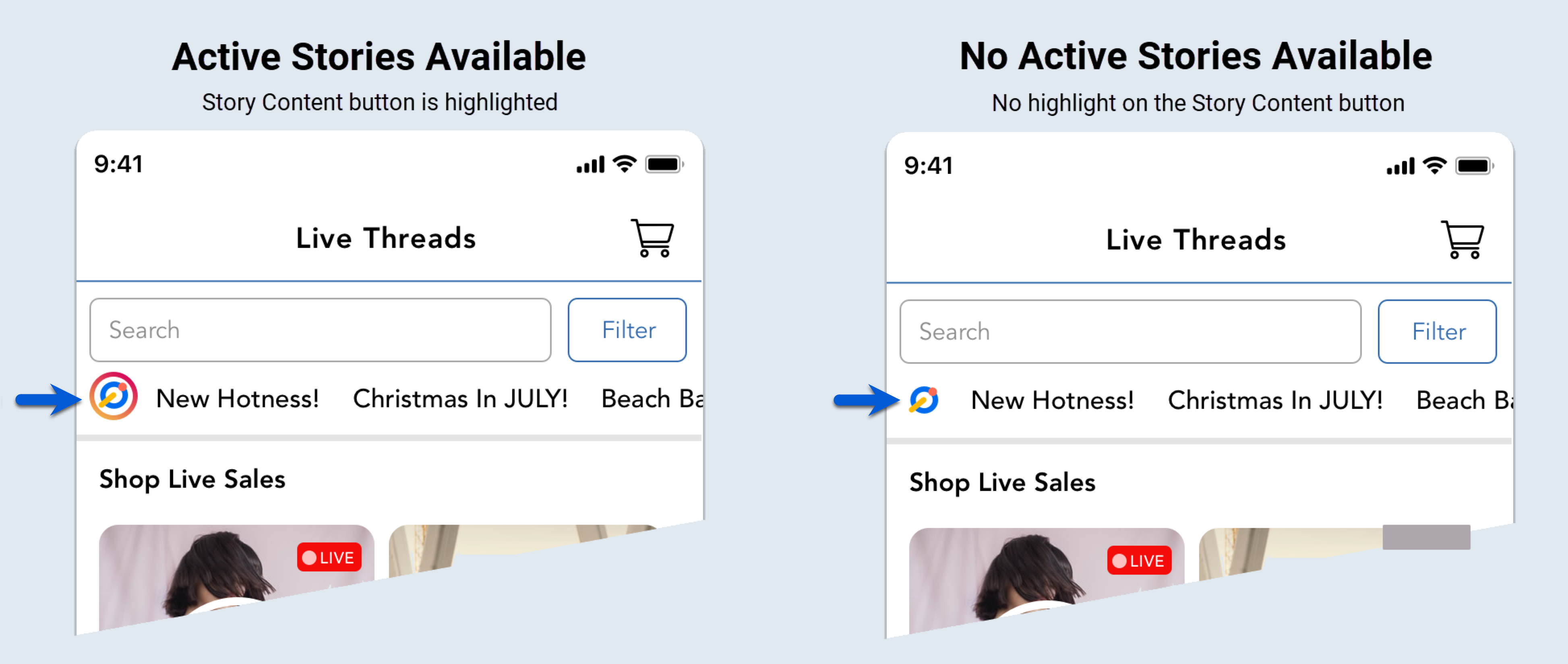 Similar to the Instagram experience, when there is an active or unviewed story available, shoppers will see a highlighted border around your shop logo toward the top-left corner of the app.