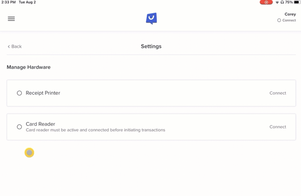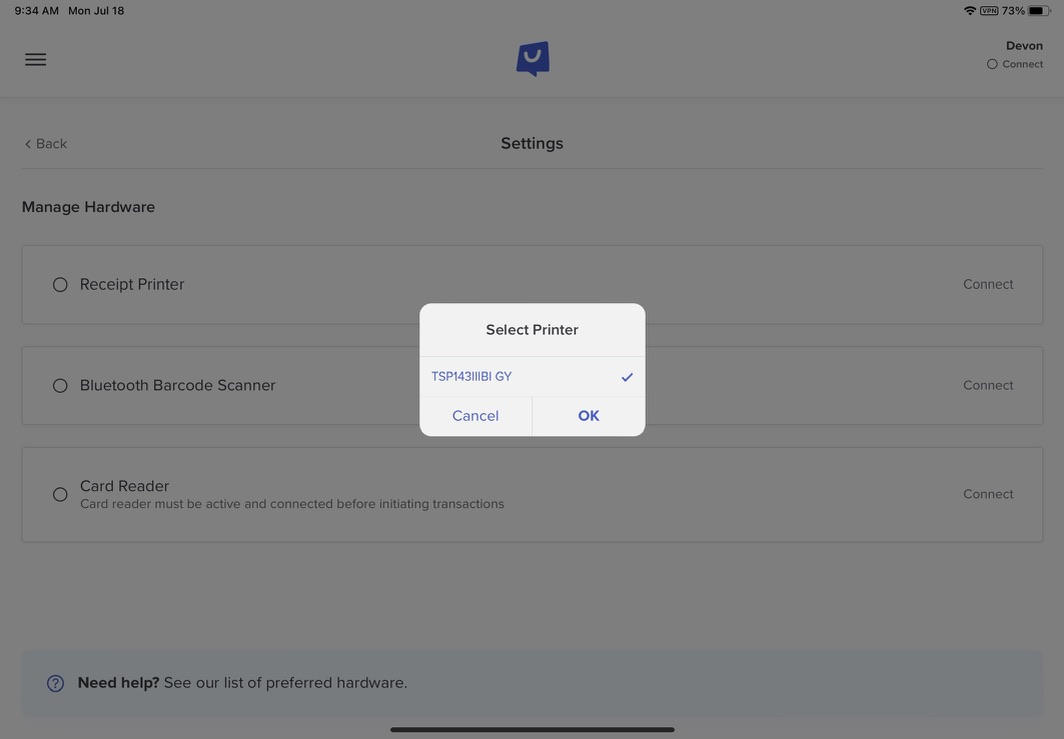 Select the Receipt Printer and then select Connect. Select your Printer from the pop-up. If you do not see your printer, make sure it is powered on and also connected already via the iPad Settings Screen under Bluetooth. |