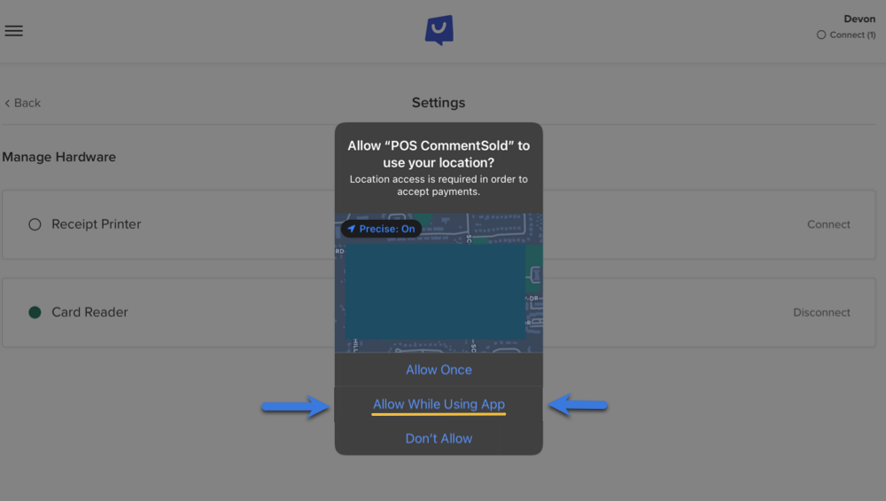 | Download the app and grant full permission in order to have your Bluetooth devices (e.g., card reader, receipt printer, and barcode scanner) work. Tap Allow While Using App to grant these permissions. | |