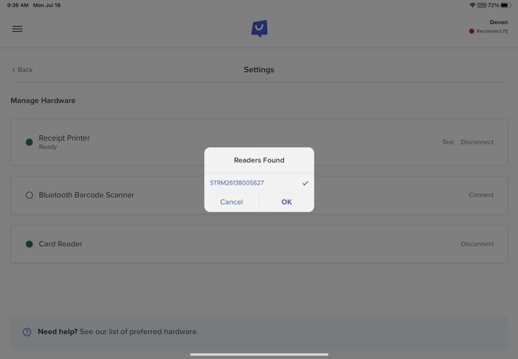 - Try logging out of the app and back in. This may jump-start the connection and force the reader to reconnect.