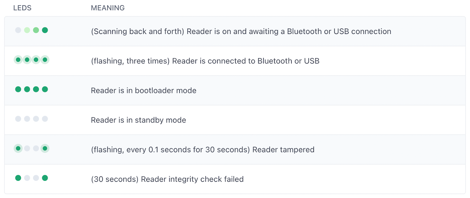When the reader is actively connecting to the app, the status LEDs on top of the reader flash four times.