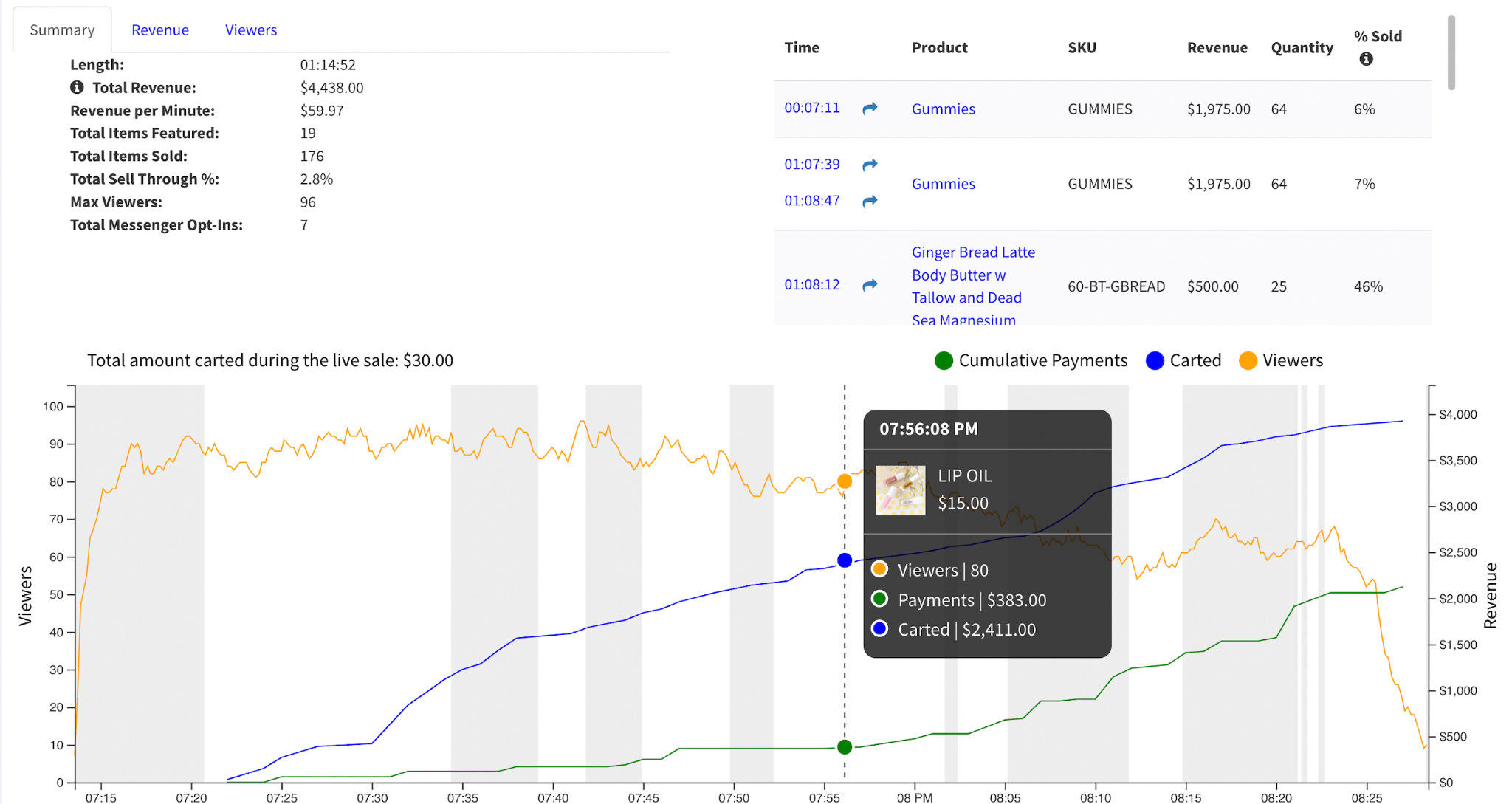 Want to see detailed reporting on your live sale performance? You can view product performance, revenue, and viewership data for a specific live.