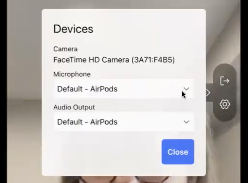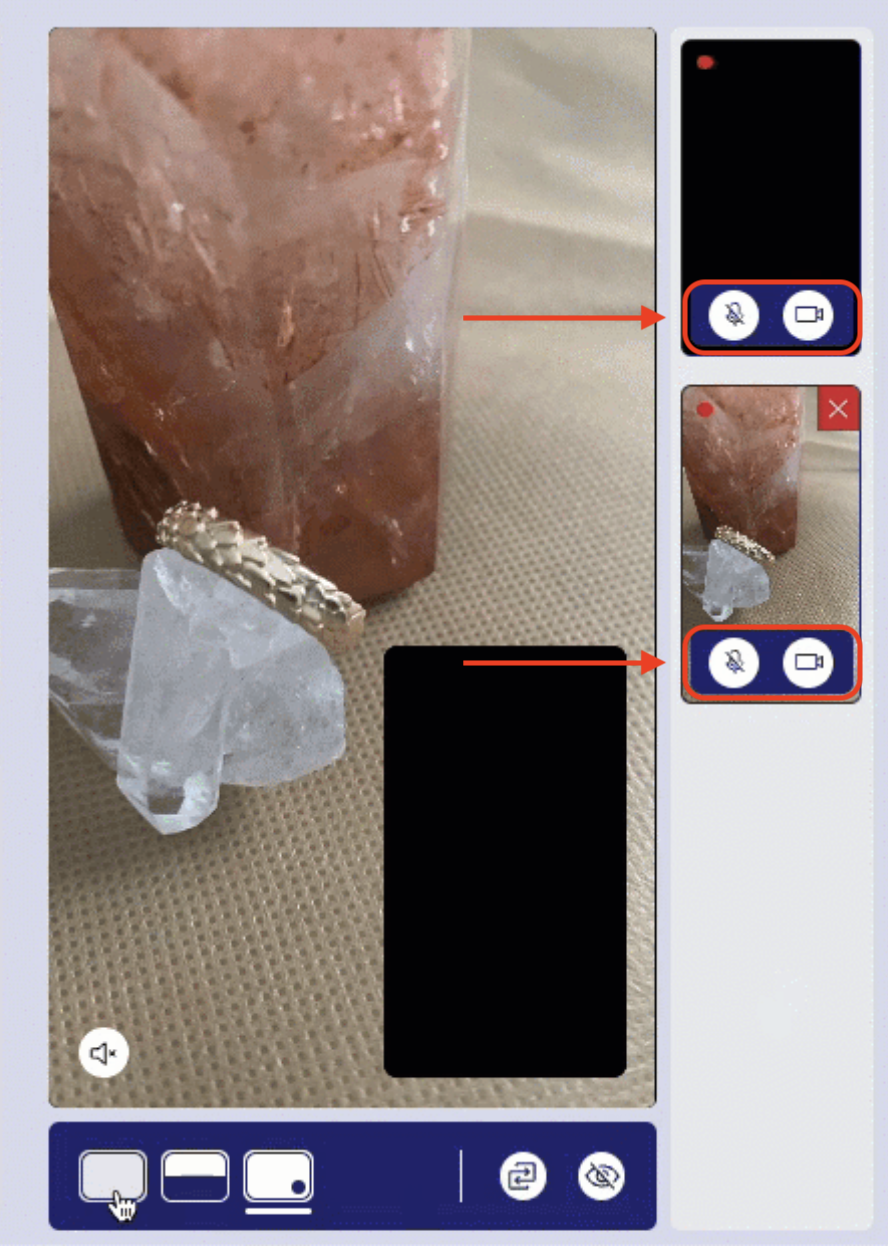 | The camera and mic icons allow you to control the camera and mic for the host and guest. To meet ADA compliance, the mic icon will blink blue when someone speaks. | |