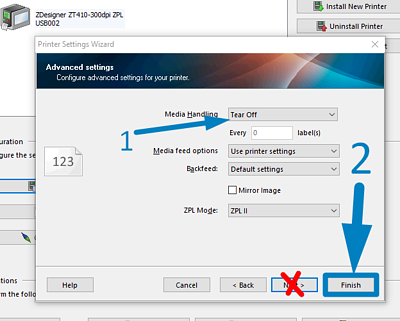 - Set Media Handling to "Tear Off" and click Finish. If you need the cutter, press "Cancel" and use the old barcode system. This method for printing barcodes is not compatible with Zebra cutters.