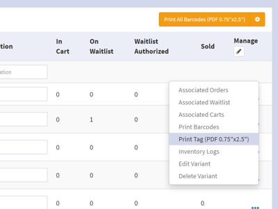Click the three dots in the Manage column next to the variant you would like to print a barcode for and select "Print Tag."