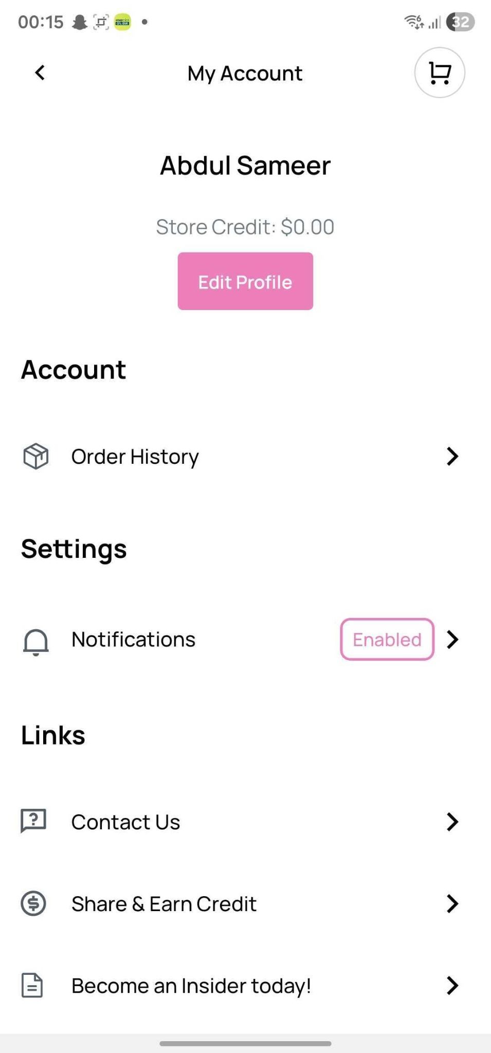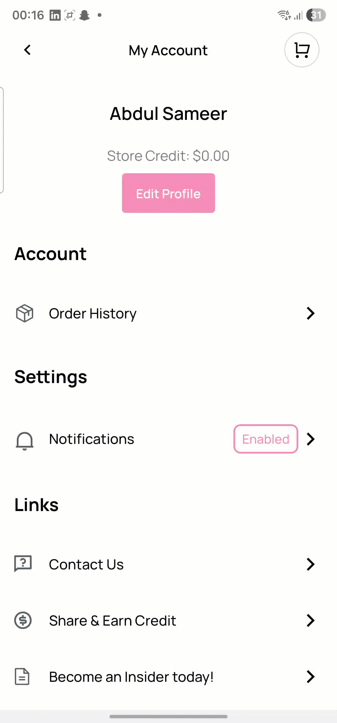 - Your Account: Tap to access the My Account section, where you can manage your profile details, view order history, update app settings, and log out.
