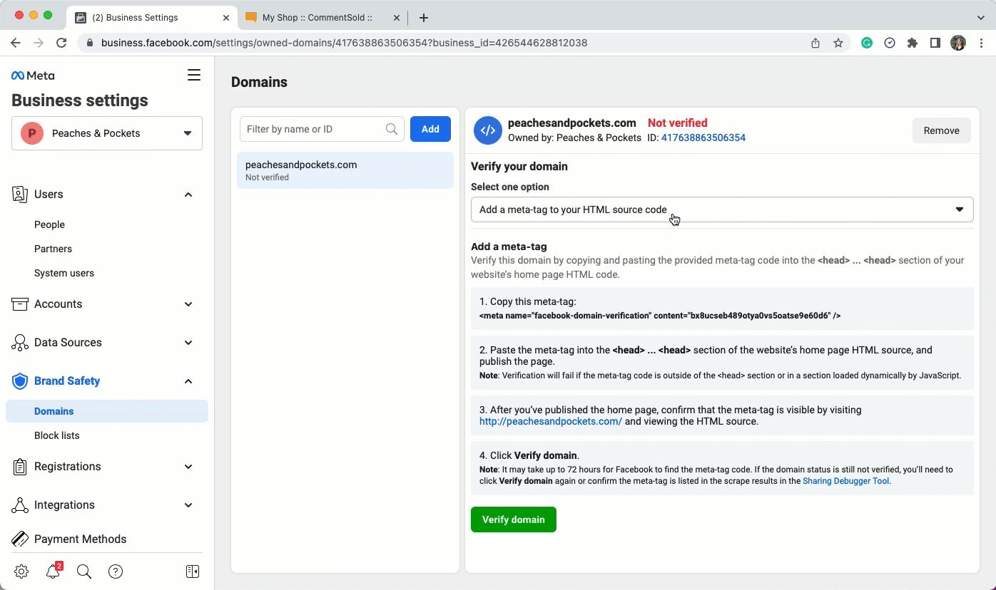 Once you add your domain, Facebook directs you to a page where you can verify your domain. Here, you'll also need to grab a verification code that you will enter in CommentSold.