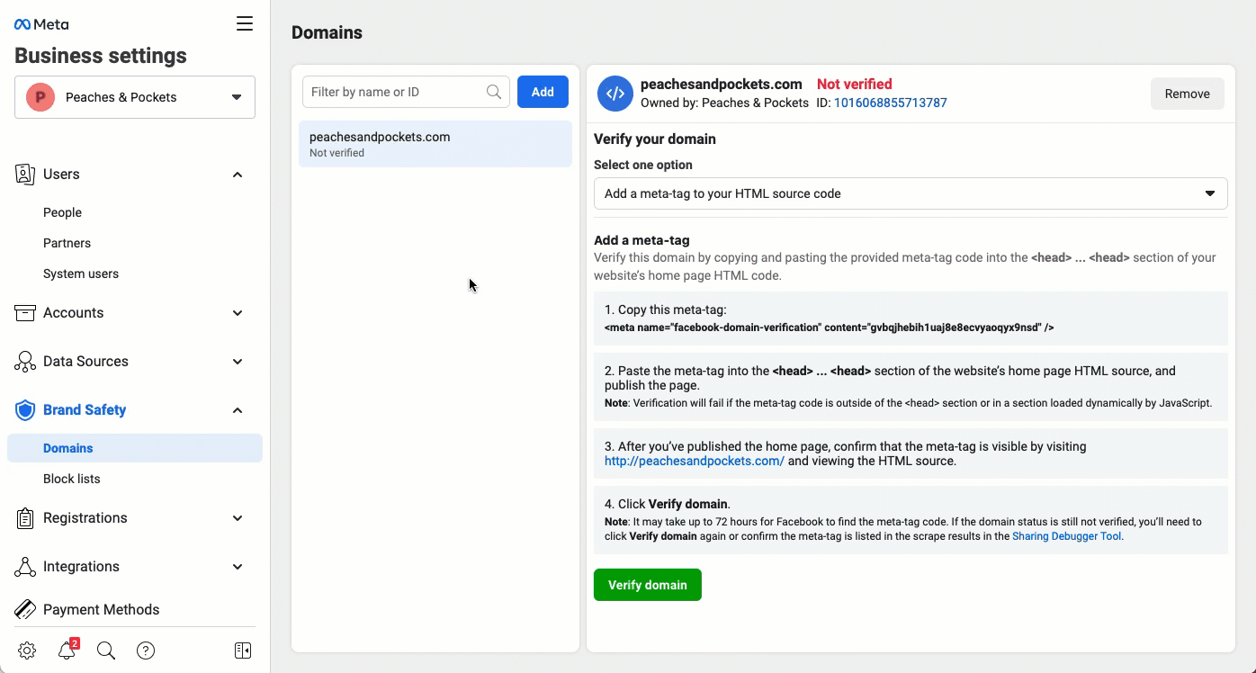 - Navigate back to your Facebook Domains tab and select Verify domain.