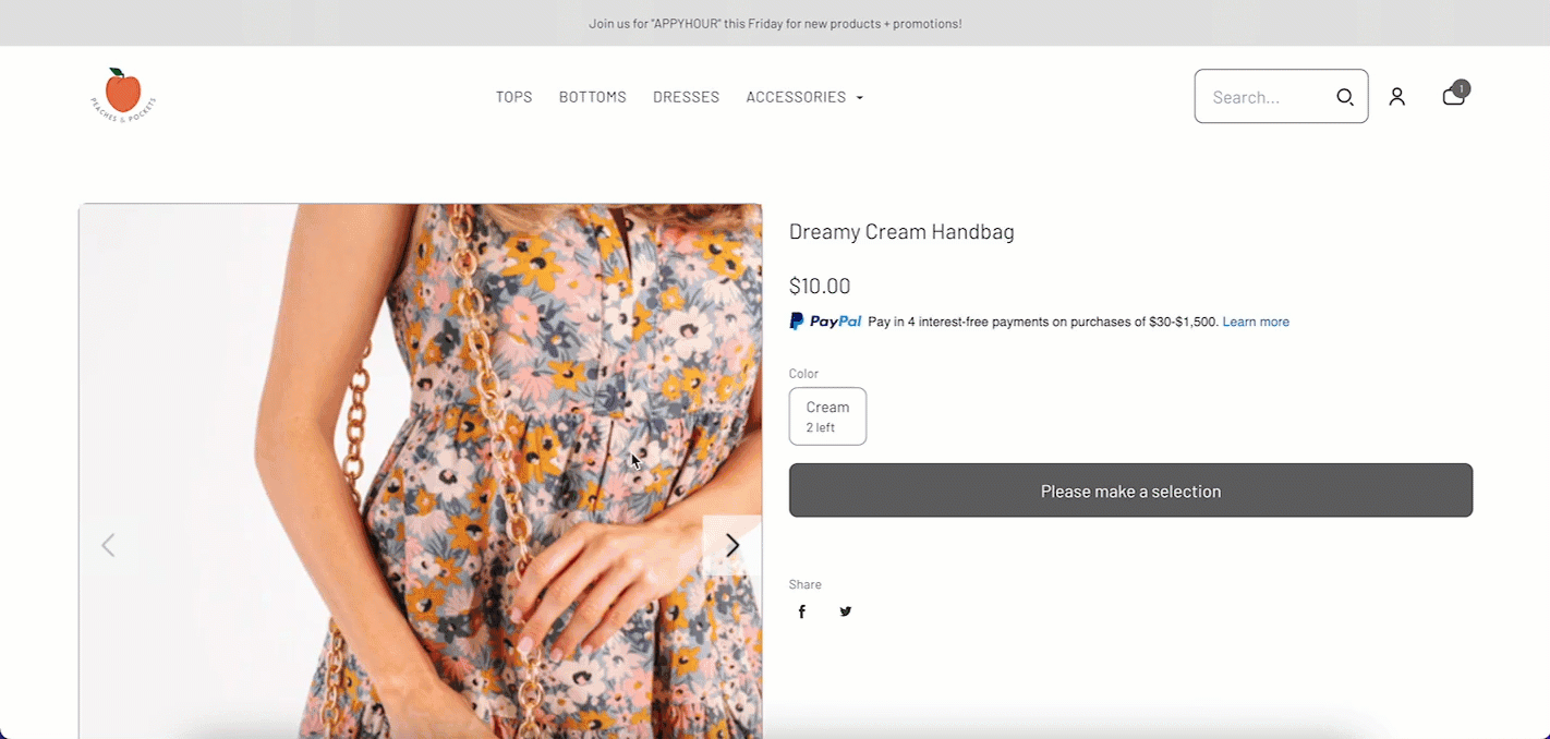 In the below screenshot, we show how the product name, Dreamy Cream Handbag, shows as the alt text in the code for the product page. This code will be picked up by screen readers.