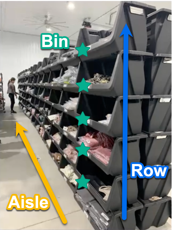 - Aisle: Aisles, in this example, are horizontal and contain rows and bins. Naming an aisle can be as easy as A, B, C, etc. and you can add numbers if aisles function as a section or department of your warehouse (e.g, A1, A2, A3, etc.).