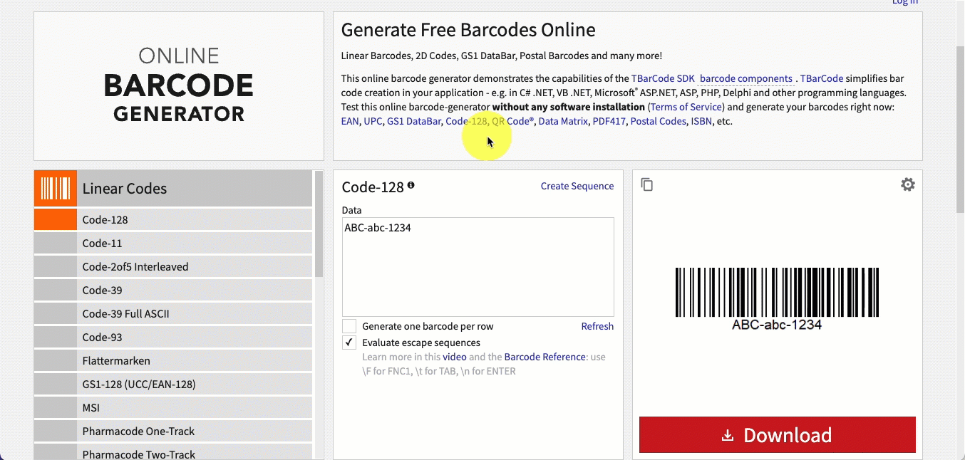 - In the Linear Codes section on the right side of the page, select Code-128.
