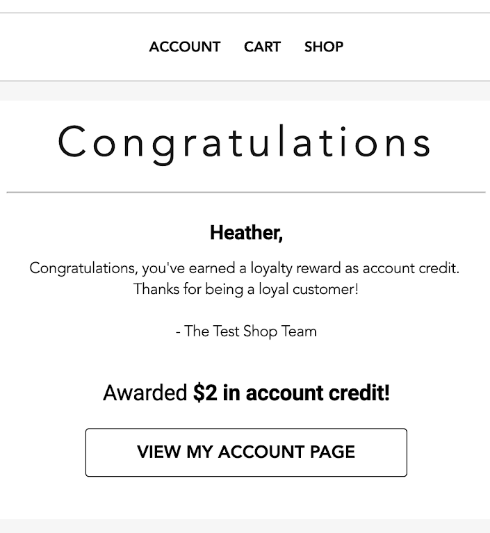 If the shopper selects the View My Account Page button, they'll be taken to their account page where they can view their current account credits.