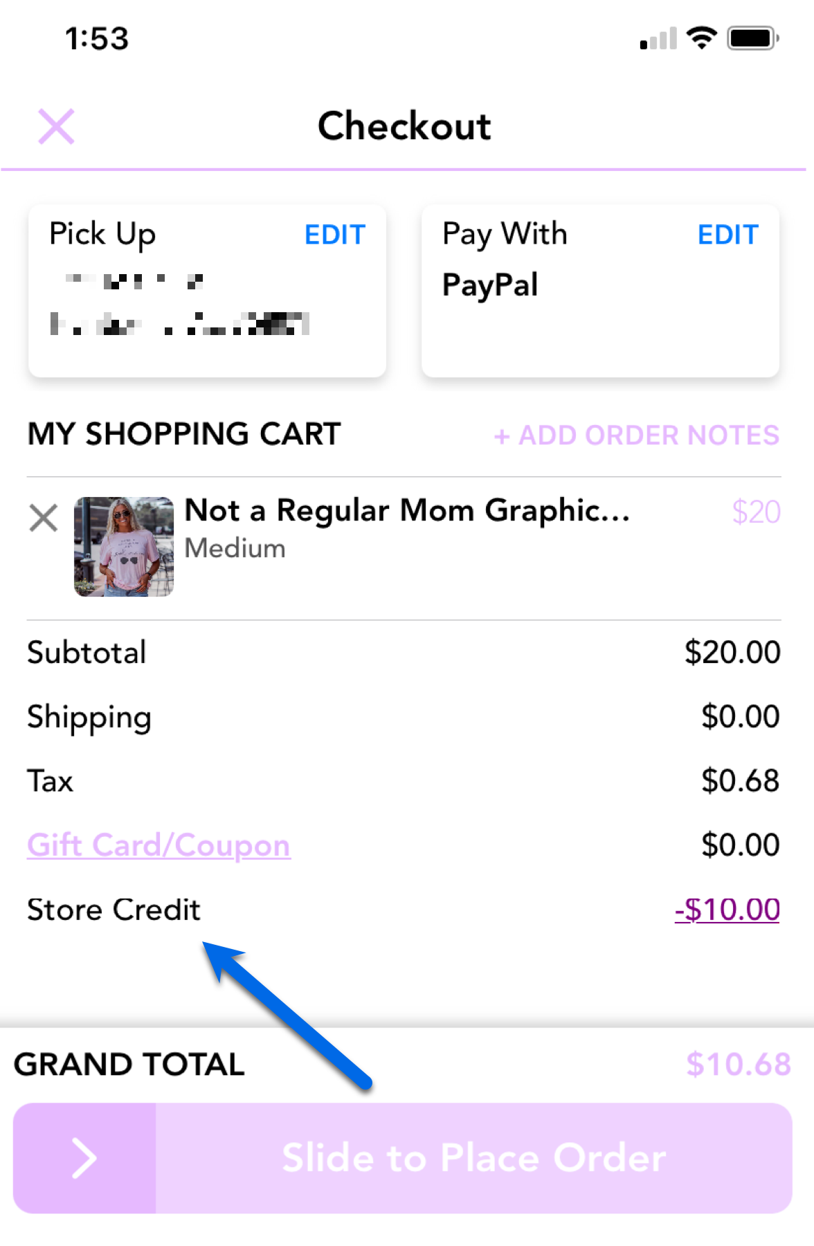 - Once the shopper is ready to check out, they can view available Store Credit at the bottom of the Checkout page.