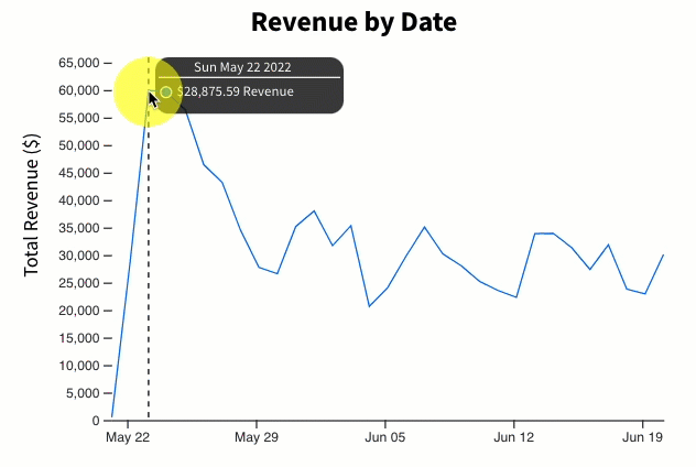 View a breakdown of total revenue by date. You can move your mouse along the graph to view the specific date and amount.