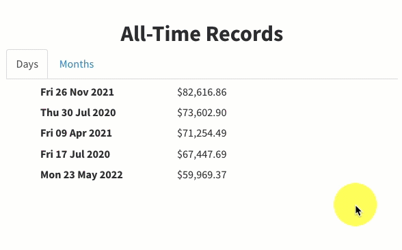 View the top five grossing days and months for your shop. You can select the Days and Months tab to move between the two lists.