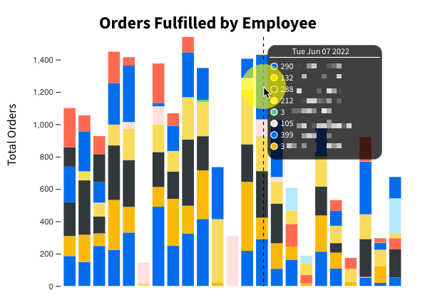 View a breakdown of orders fulfilled by date and employee. You can move your mouse along the graph to view the specific date and employee totals. Employee names appear to the right of their total and each employee has a color assigned so you can easily locate an employee in the graph.