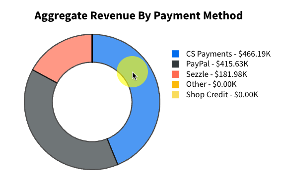 Revenue by Payment Method sums sales data across all payment methods and breaks down that total by individual payment method (e.g., CS Payments, Sezzle, etc.). Revenue does not include store credit and discounts.