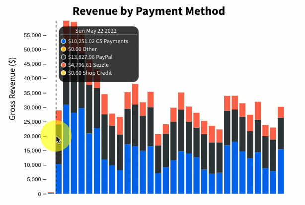View a breakdown of revenue by date and payment method. You can move your mouse along the graph to view the specific date and payment method totals. Payment method names appear to the right of their total and each method has a color assigned so you can easily locate that method in the graph.