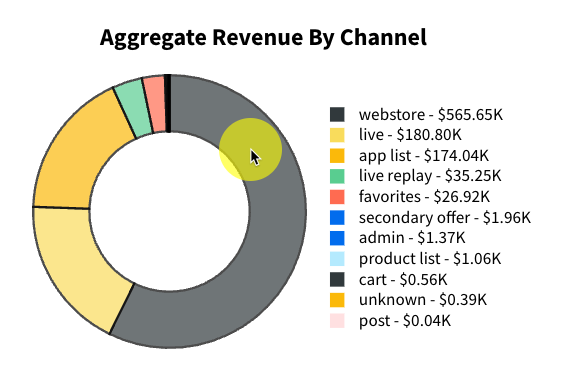 Revenue by Sales Channel sums sales data across all sales channels and breaks down that total by individual sales channel (e.g., webstore, mobile app, etc). CommentSold also includes the following channels as more refined sources: favorites (in the app), live replays, secondary offers, product lists (on the shopper’s account page), and more. Revenue by Sales Channel does not include discounts.