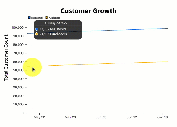 View a snapshot of registered shoppers and purchasing customers. You can move your mouse along the graph to view the specific totals by date. Totals update at the end of the day (e.g., 11:59 PM of your shop’s time zone).