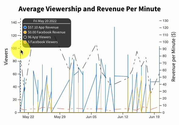 View a breakdown of live sale viewership and revenue totals by platform. You can move your mouse along the graph to view the specific date and totals.