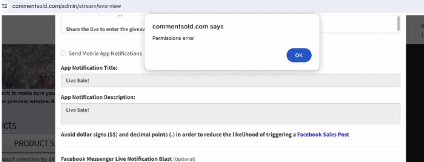 - Error Message Location: The Live Overview page in your CommentSold account.