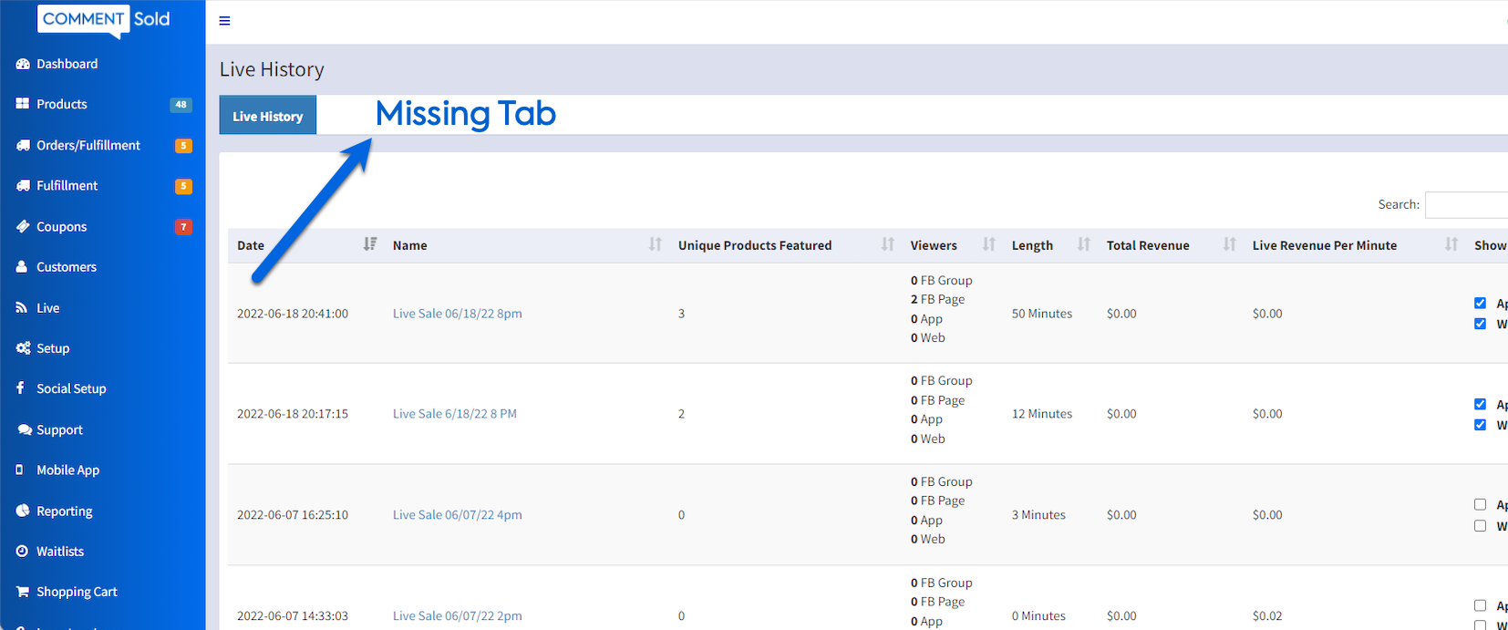 - Issue Location: The Live page in your CommentSold account.