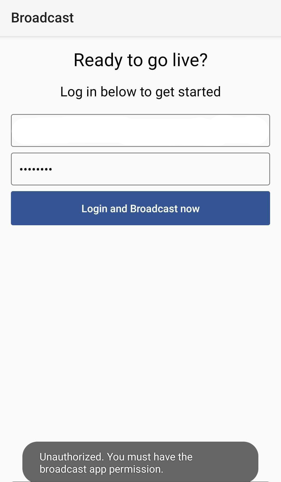 - Cause of Error: You are either not logged in as the Super Admin or you're not assigned the Can Use the Broadcast App permission, which is required to begin a live stream on the device with the CommentSold Broadcast App installed.
