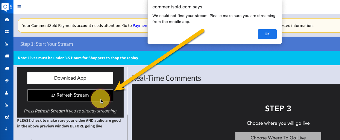 - Cause of Error: Your Live Overview can’t connect to the CommentSold Broadcast App live stream.