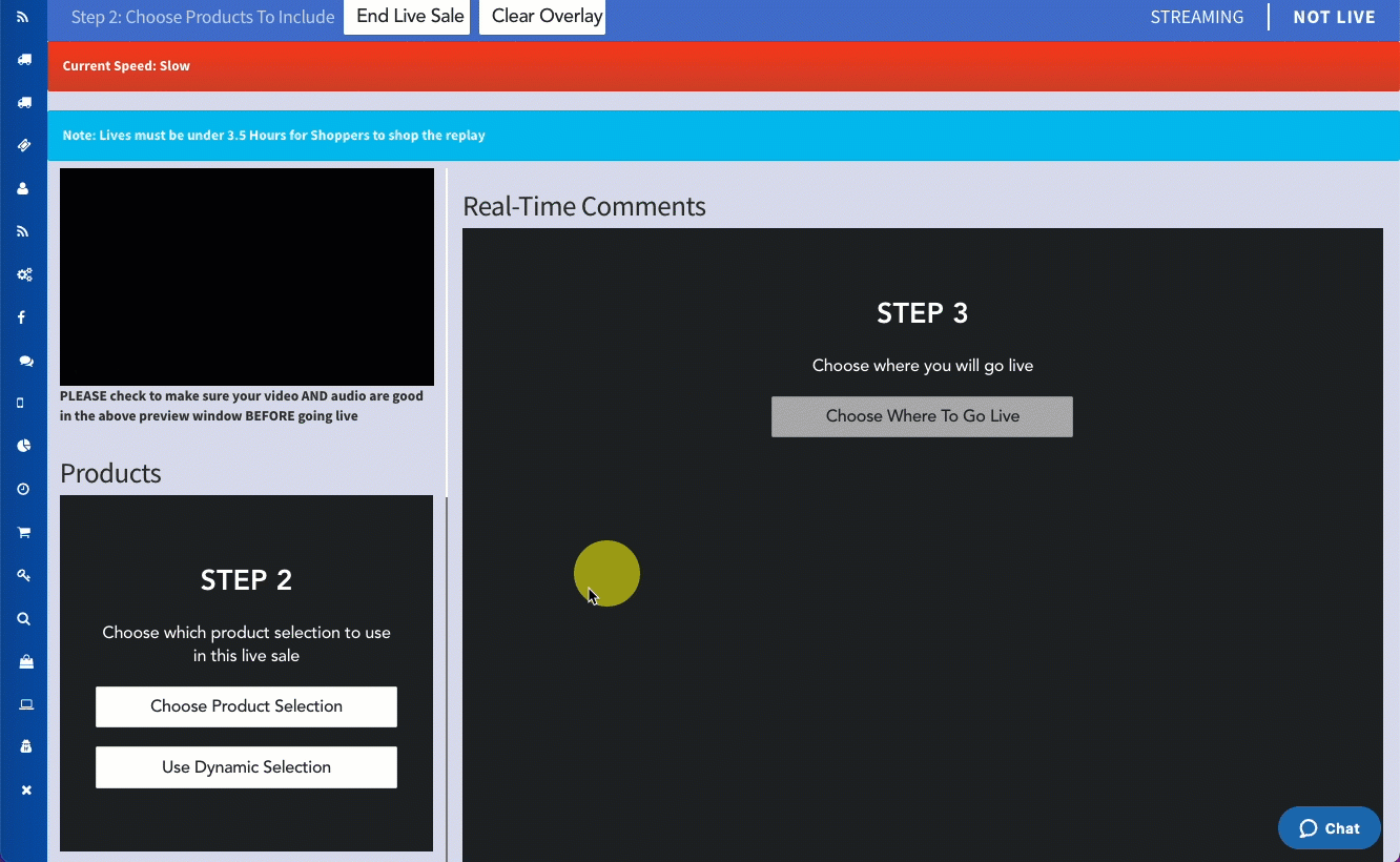 If you experience an issue with going live that we do not detail below, please contact our Support team by selecting the blue chat icon in the bottom-right corner of your CommentSold dashboard.
