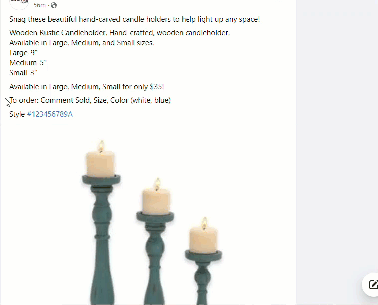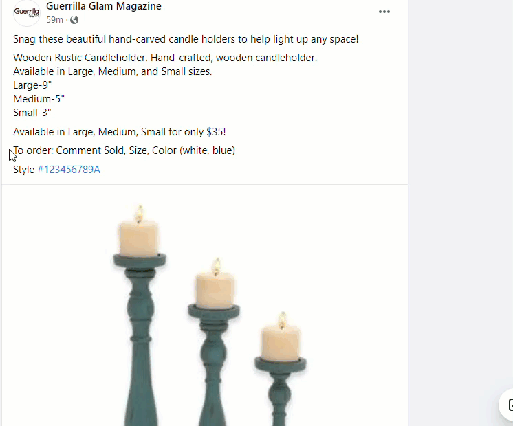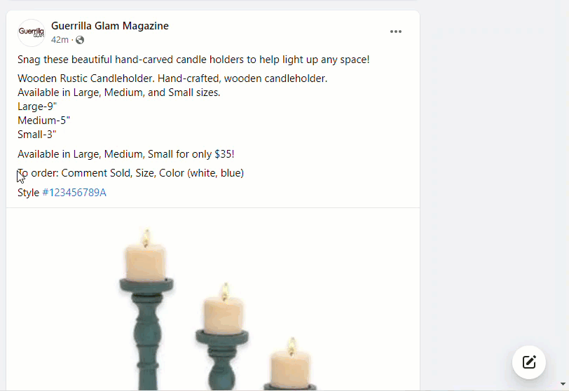 • Without a letter identifier. When shoppers comment on Facebook posts that feature one item, the comment does not need to include a letter identifier. Shoppers will comment with SOLD, the desired amount, and any variants (e.g., SOLD 10 blue small).