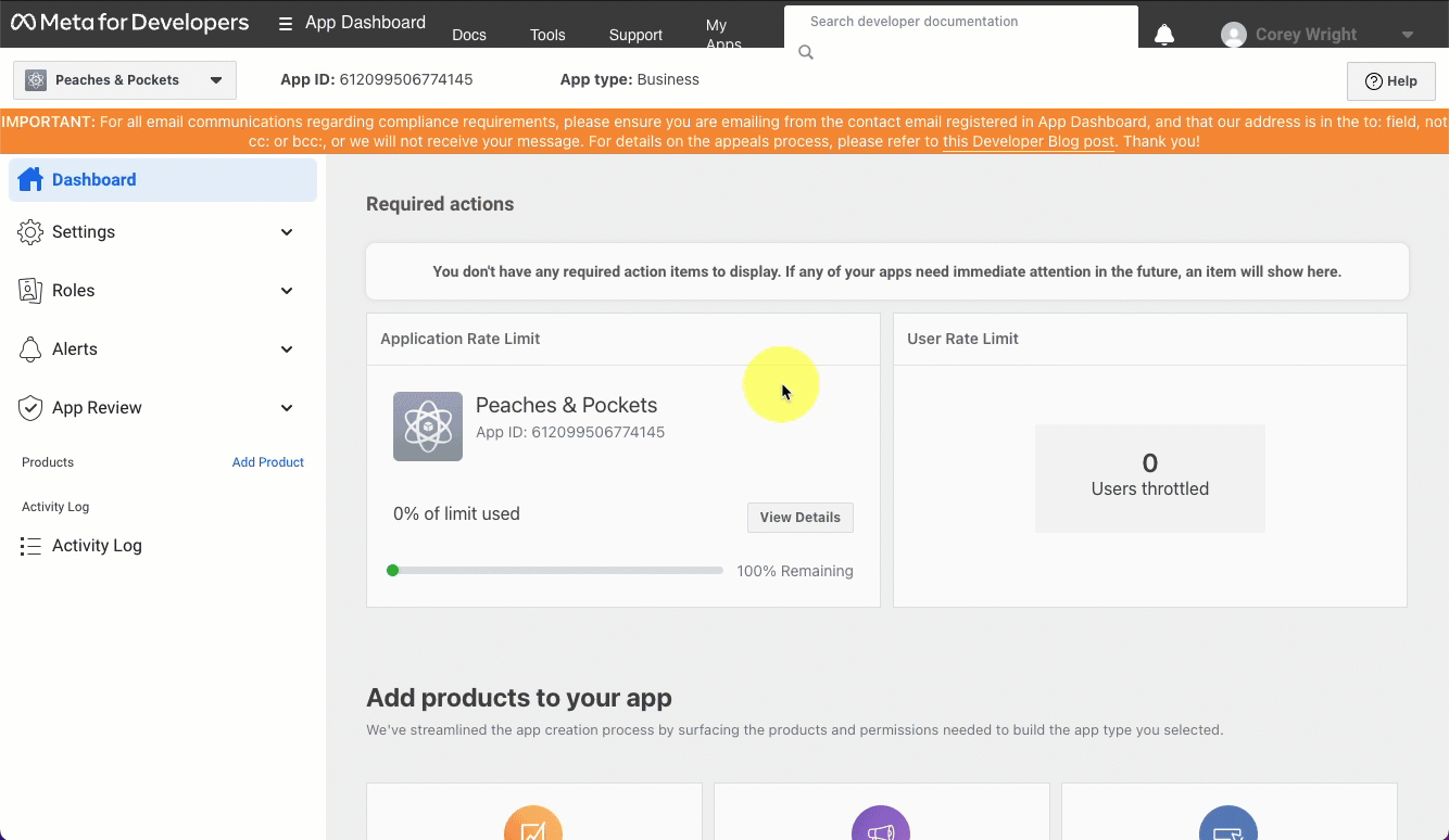 - Select Settings in the side menu on your App Dashboard, then select Basic.