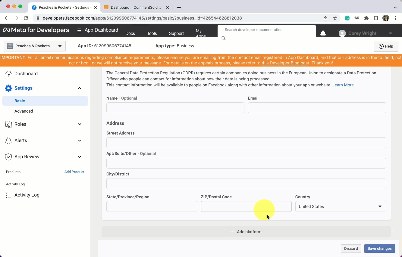- In the Privacy Policy URL section, enter this URL https://commentsold.com/privacy_policy.