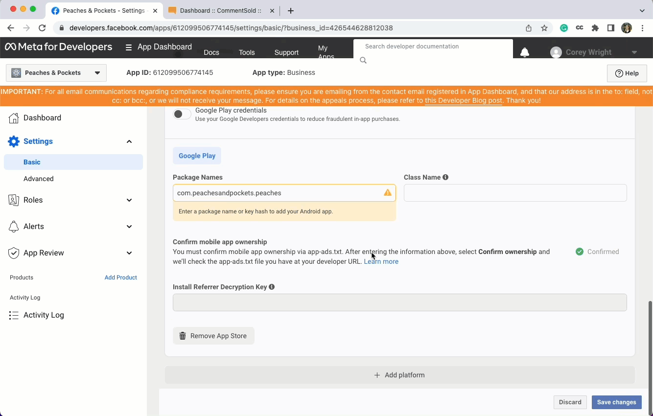 - On your Facebook Developer tab or page, paste the text you copied into the Google Play Package Name field. This field is the only field you need to complete.