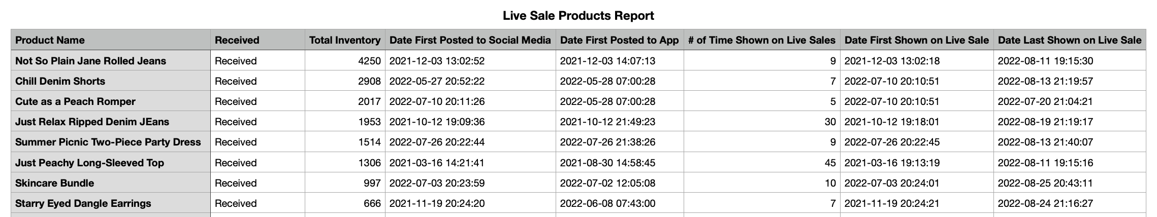 The Live Sale Products Report (CSV #30) shows retailers how many times they've featured a specific product in live sales, including the first and last date they featured the product.