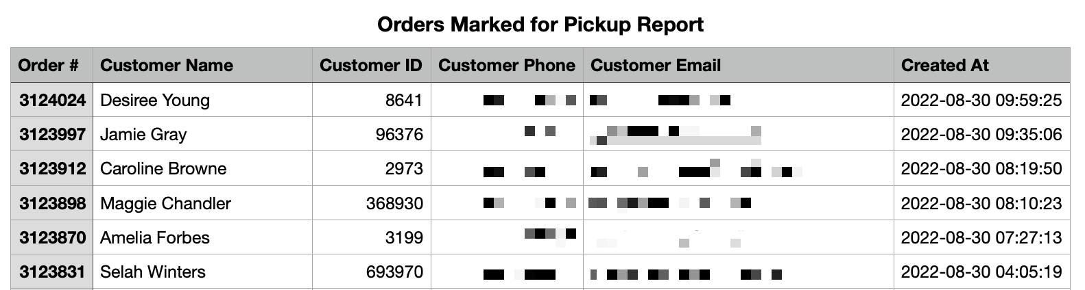 The Orders Marked for Pickup Report (CSV #32) allows retailers to view all orders marked for local pickup that the purchasing customer has not picked up. This report contains contact information for these customers, including phone and email.