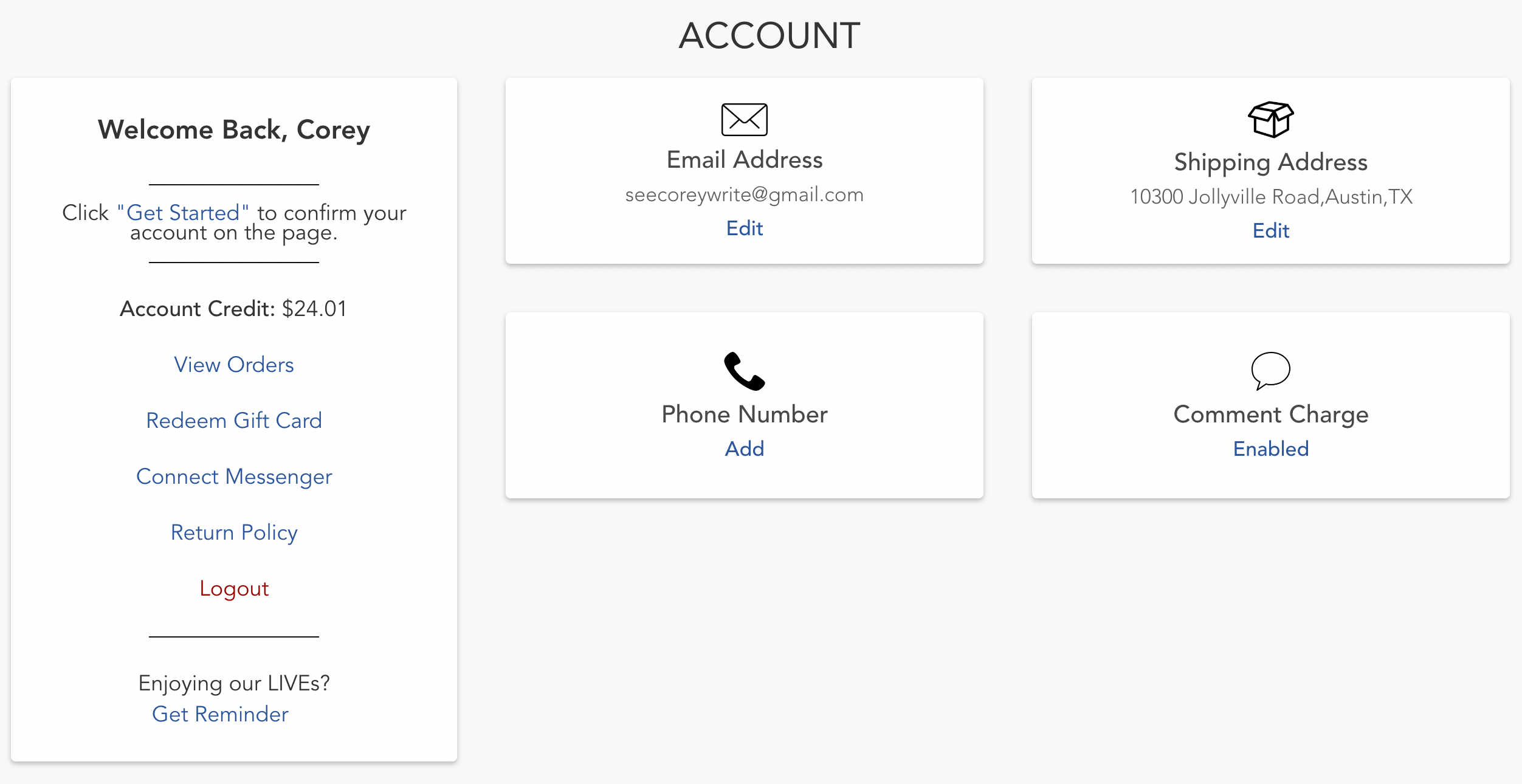 When a shopper adds a product to their cart from a live sale and/or by commenting SOLD on a live sale post, featured product post, and/or Instagram story, they will be linked to their webstore account page to check out.