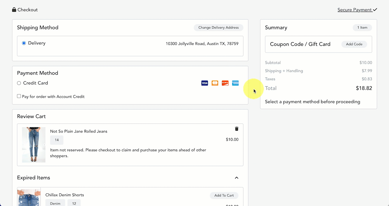 In the Checkout section, shoppers can select their shipping method and payment method, and review their shopping cart. If shoppers have a discount or coupon code, they'll enter this code on the right side of the page.